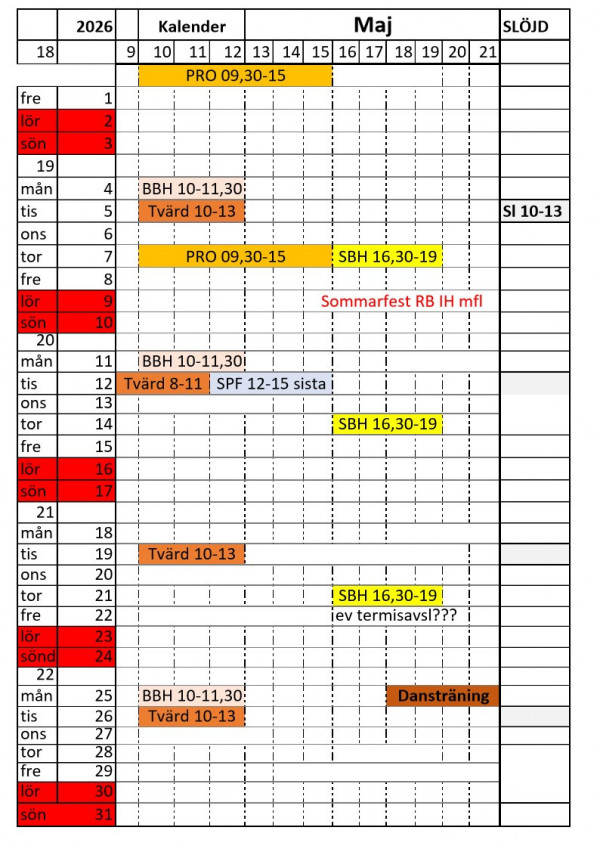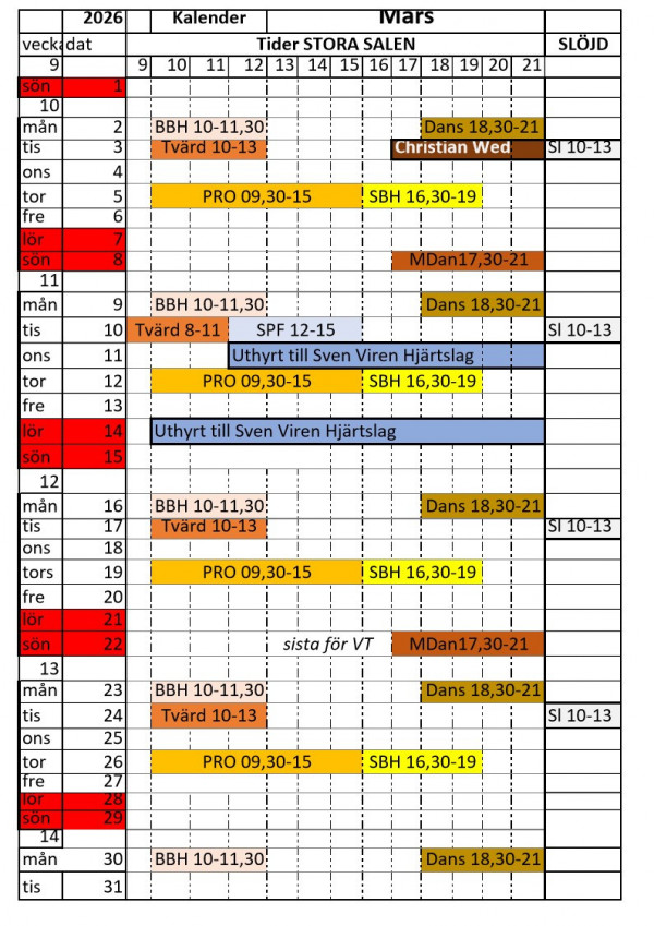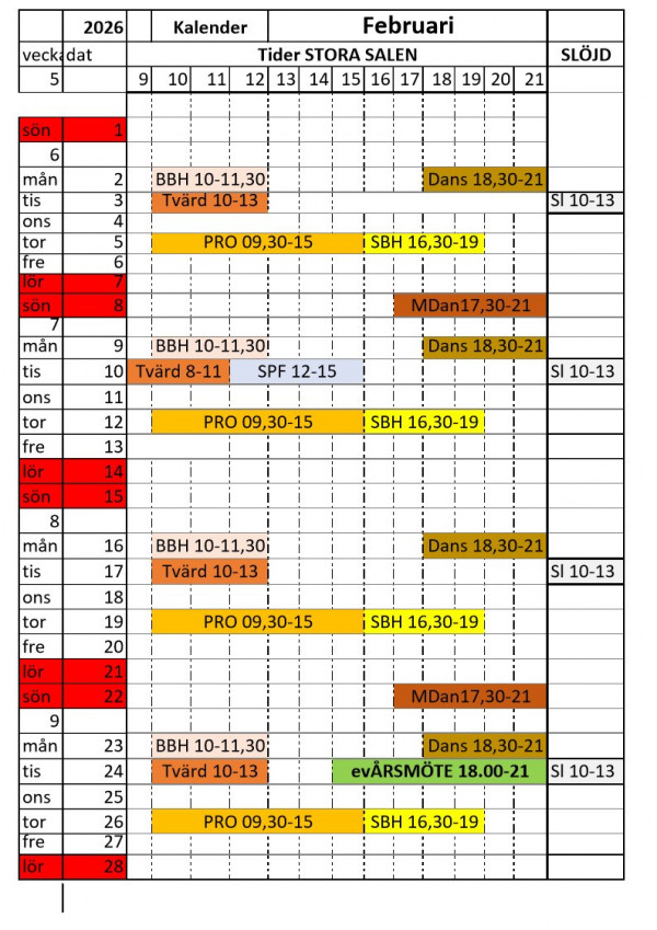Vi kommer att uppdatera kalendern med nya bokningar och aktiviteter.
